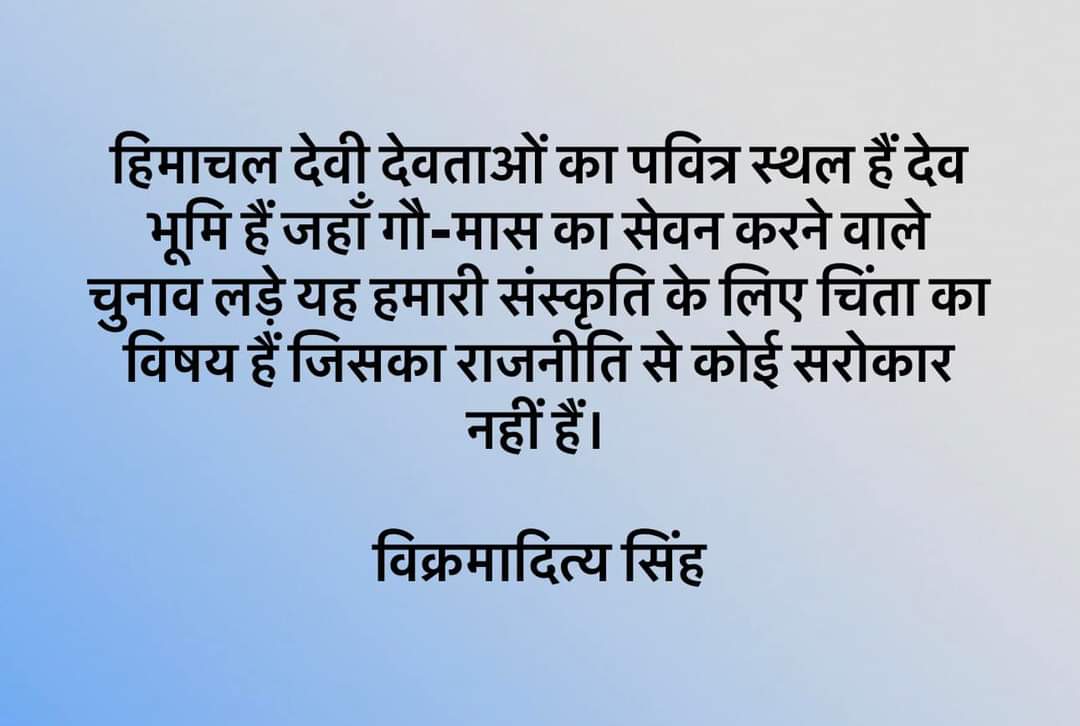 उन्होंने कंगना रनौत का नाम लिए बिना सोशल मीडिया प्लेटफॉर्म फ़ेसबुक पर लिखा, “हिमाचल देवी-देवताओं का पवित्र स्थल है. देवभूमि है. यहां गोमांस का सेवन करने वाले चुनाव लड़ें, ये हमारी संस्कृति के लिए चिंता का विषय है, जिसका राजनीति से कोई सरोकार नहीं है.”