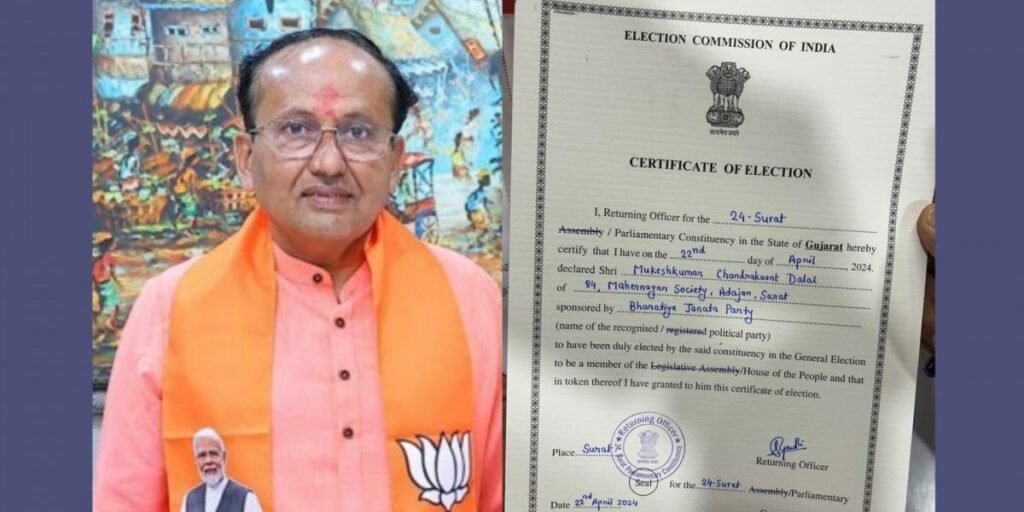 ऐसा तब हुआ जब कांग्रेस पार्टी के उम्मीदवार नीलेश कुंभानी का पर्चा रद्द होने के बाद बाकी सभी निर्दलीय उम्मीदवारों ने अपना पर्चा वापस ले लिया, जिसके बाद सूरत के कलेक्टर और रिटर्निंग ऑफ़िसर द्वारा भाजपा प्रत्याशी मुकेश दलाल को निर्विरोध विजेता घोषित कर दिया गया.