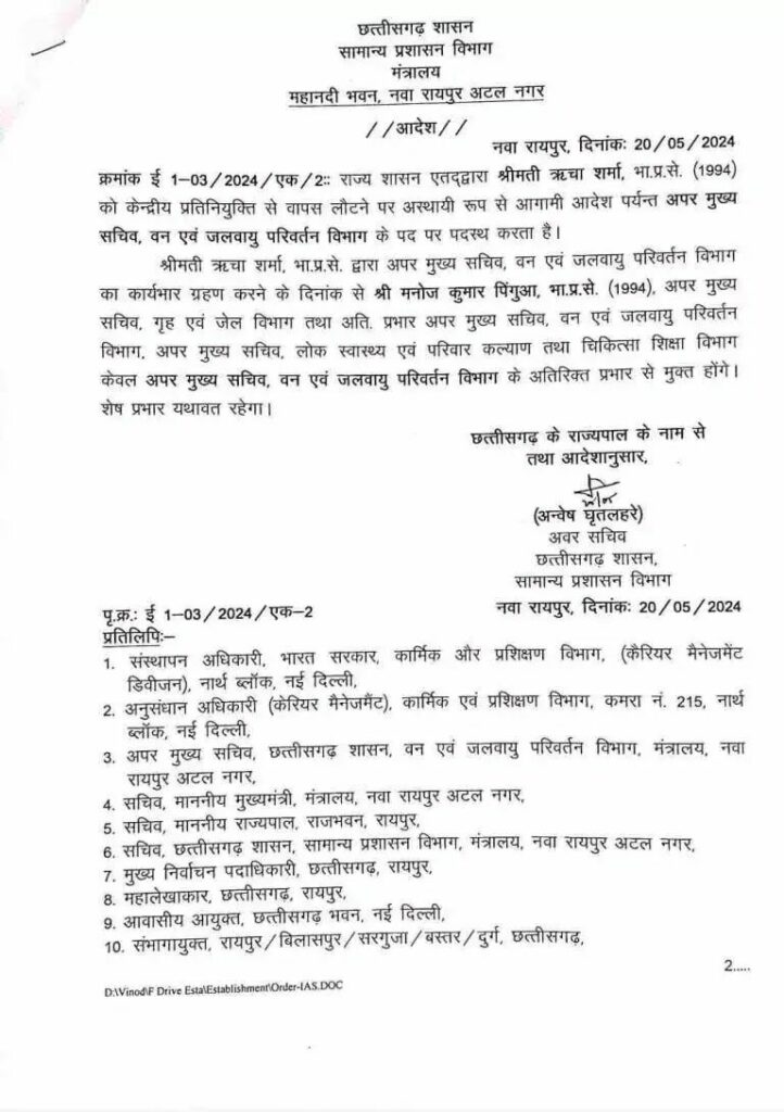 केंद्रीय प्रतिनियुक्ति से वापस छत्तीसगढ़ लौटीं आईएएस ऋचा शर्मा को बड़ी जिम्मेदारी दी गई है। उन्हें अपर मुख्य सचिव, वन एवं जलवायु परिवर्तन विभाग के पद पर नियुक्त किया गया है।