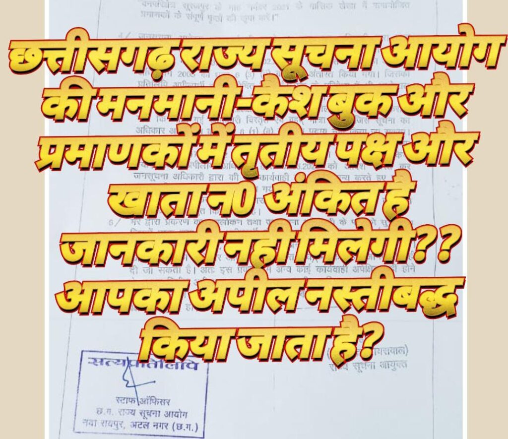 रायपुर-छत्तीसगढ़ राज्य सूचना आयोग की कार्यप्रणाली पर सवालिया निशान उत्पन्न हो रहा है इसका कारण महज एक है कि अपीलार्थियों द्वारा जानकारी जन सूचना अधिकारी से नही मिलने के कारण प्रथम अपील धारा 19(1) के तहत करने पर अपील का निर्णय यह कहकर खारिज किया जा रहा है कि कैशबुक और प्रमाणको में मजदूरों का खाता न0 अंकित रहता है जिससे वह गोपनीय और तृतीय पक्ष की जानकारी होने से धारा 8 और 11 के उपधाराओं हवाला देकर खारिज किया जाता है।