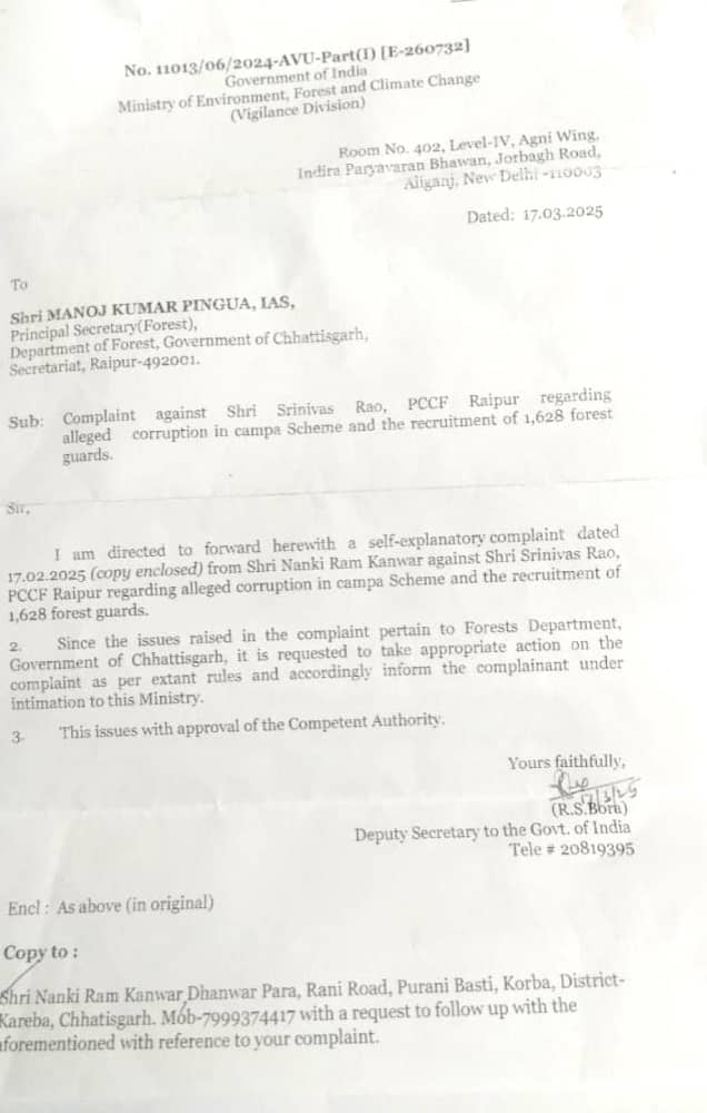 17 मार्च 2025 को जारी इस पत्र में छत्तीसगढ़ के प्रधान सचिव (वन विभाग) मनोज कुमार पिंगुआ को निर्देशित किया गया है कि वे मामले की जांच करें और उचित कार्रवाई करें। मंत्रालय ने राज्य सरकार से कहा है कि वह नियमानुसार आवश्यक कदम उठाए और शिकायतकर्ता को भी इसकी जानकारी दे।