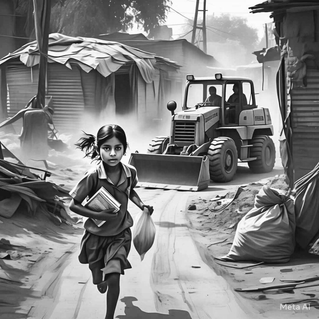 नई दिल्ली. उत्तरप्रदेश के कुछ शहर के झुग्गी इलाकों में अतिक्रमण हटाने की मुहिम जारी है, लेकिन इस प्रक्रिया में कई गरीब परिवारों का भविष्य दांव पर लग रहा है। हाल ही में सामने आई एक तस्वीर ने इस सच्चाई को उजागर कर दिया, जिसमें एक मासूम बच्ची हाथ में किताबें और एक थैली लिए अपने उजड़ते घर से भागती नजर आ रही है, जबकि पीछे एक बुलडोज़र बस्तियों को जमींदोज़ कर रहा है।