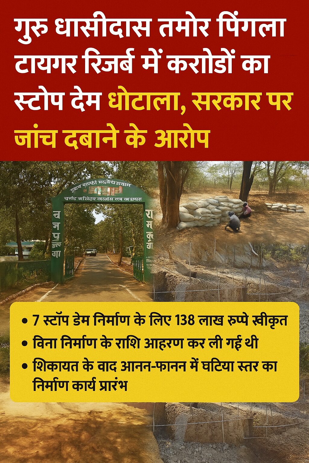 - गुरु घासीदास तमोर पिंगला टाइगर रिजर्व में करोड़ों का स्टाप डेम घोटाला, सरकार पर जांच दबाने के आरोप