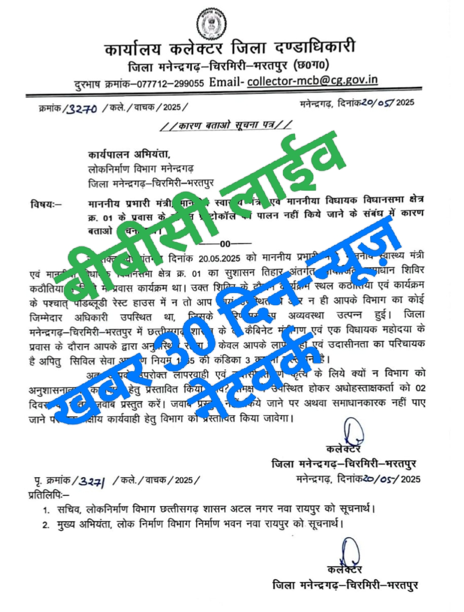 उन्होंने कारण बताओ नोटिस में दो दिनों के भीतर जवाब मांगा है और चेताया है कि जवाब असंतोषजनक हुआ तो अनुशासनात्मक कार्रवाई प्रस्तावित की जाएगी।