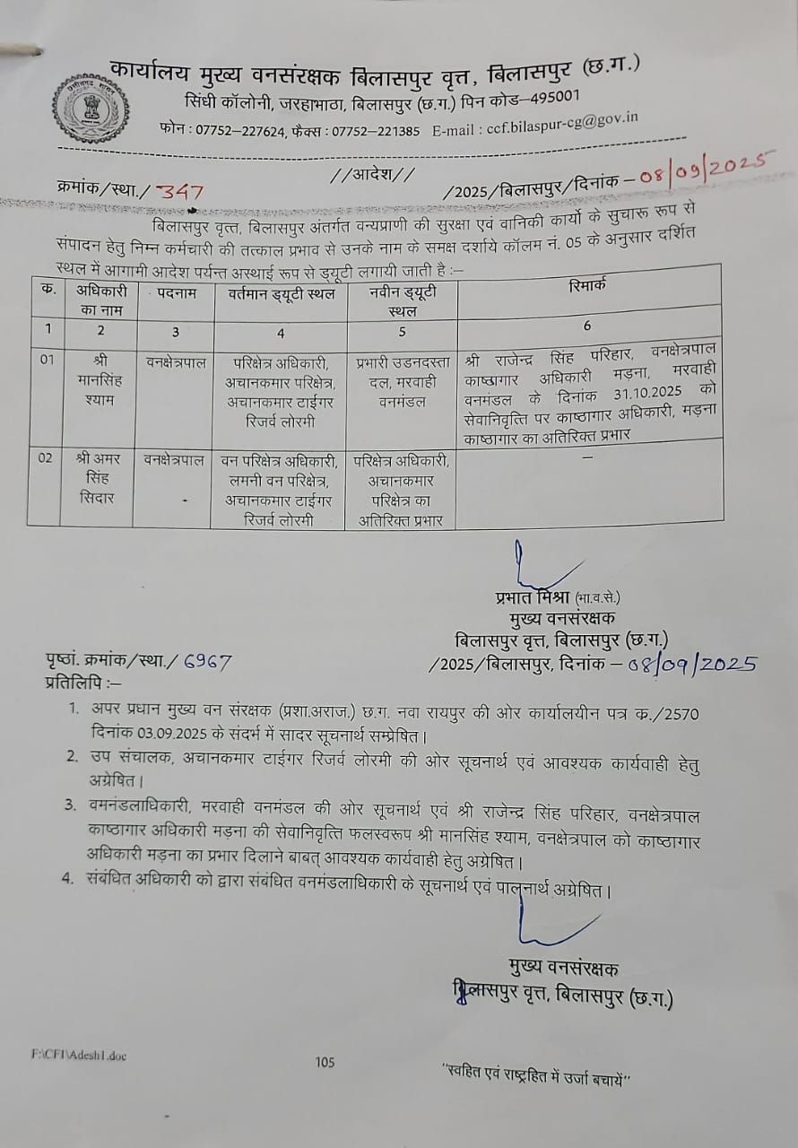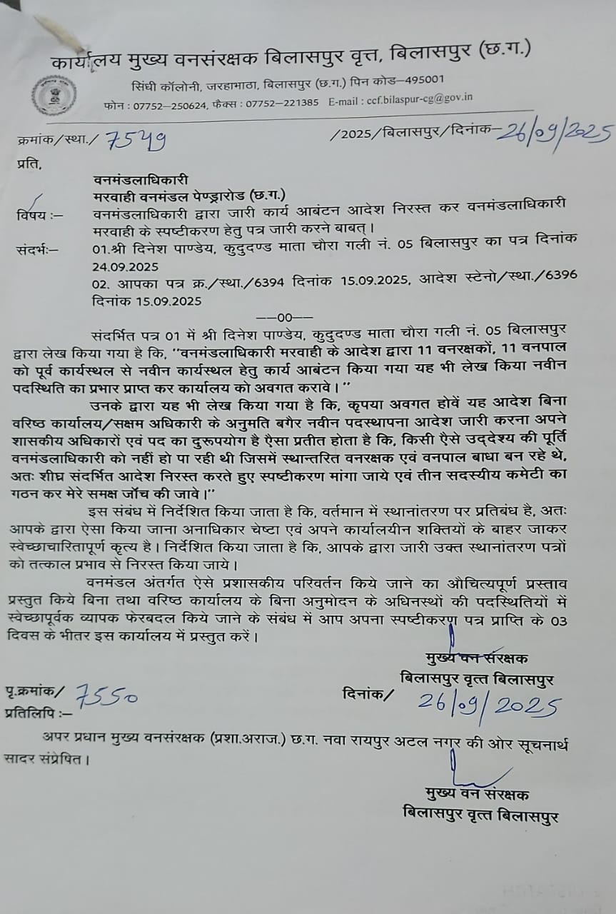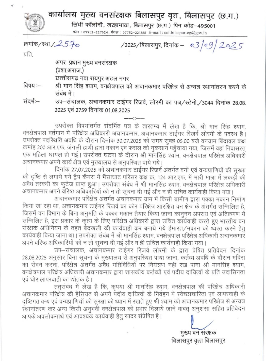 जानकारी के अनुसार, CCF प्रभात मिश्रा ने पहले रेंजर मान सिंह स्याम के खिलाफ कार्य में लापरवाही का हवाला देते हुए, प्रधान मुख्य वन संरक्षक बिलासपुर को पत्र क्रमांक /स्था/2570 दिनांक 3 सितंबर 2025 को कार्रवाई हेतु प्रस्ताव भेजा था।