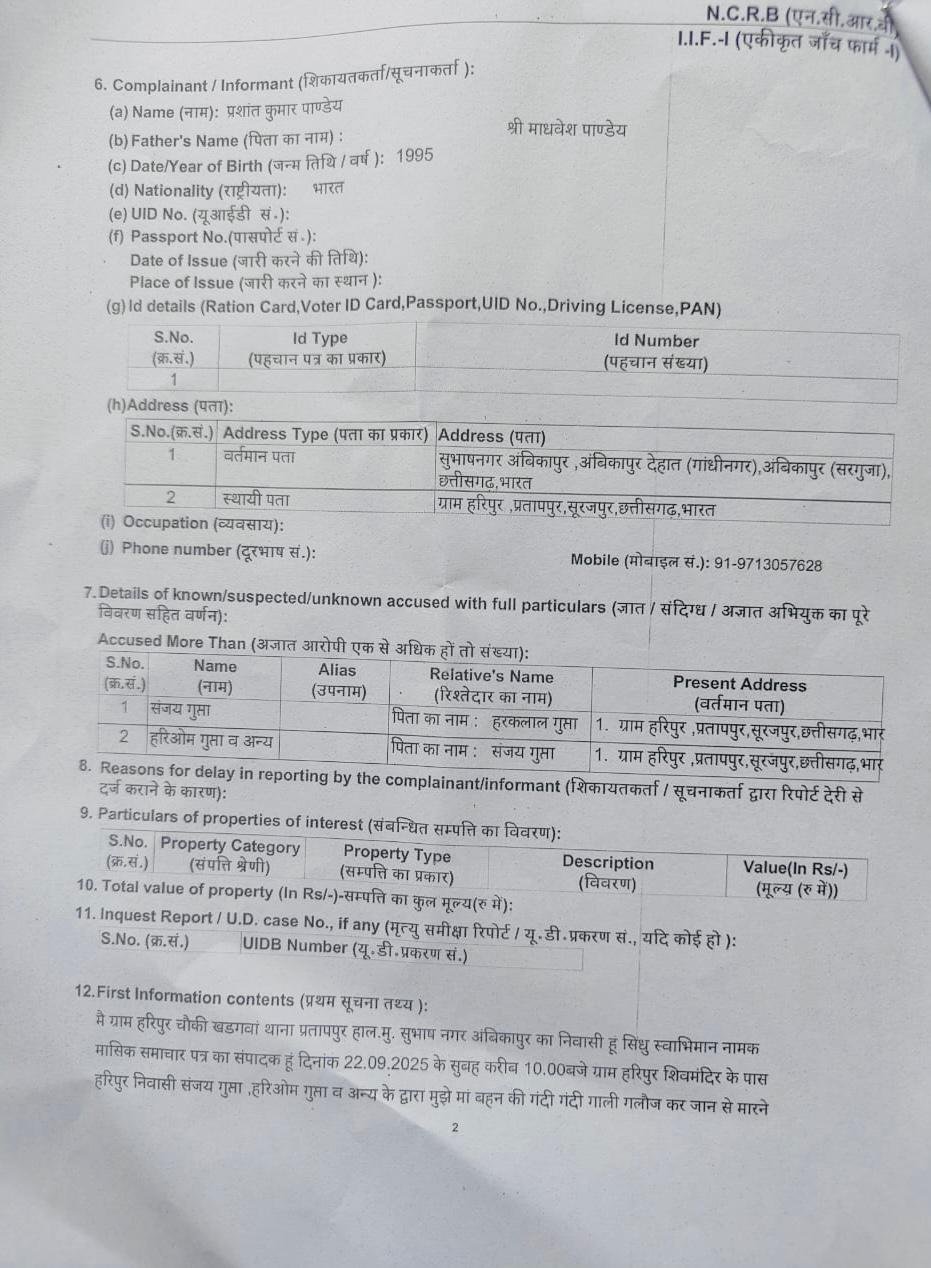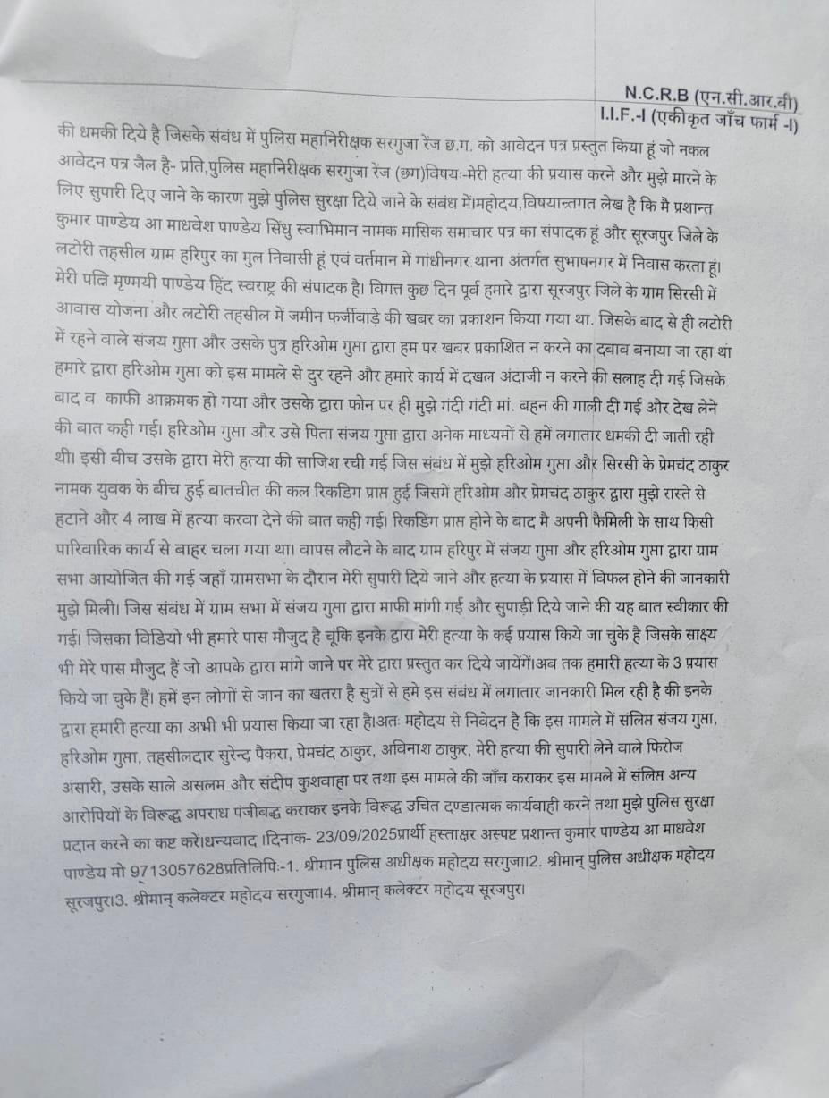सूरजपुर जिले में पत्रकारिता पर हमले और सत्ता–माफिया गठजोड़ का एक सनसनीखेज और लोकतंत्र को झकझोर देने वाला मामला सामने आया है। पत्रकार के हत्या की सुपारी देने के गंभीर आरोपों में लटोरी तहसीलदार सुरेंद्र साय पैंकरा, उनके करीबी भूमाफिया संजय गुप्ता, हरिओम गुप्ता, तथाकथित पत्रकार फिरोज अंसारी, उसके साले असलम सहित अन्य आरोपियों के विरुद्ध प्रतापपुर थाना में अपराध दर्ज कर लिया गया है।