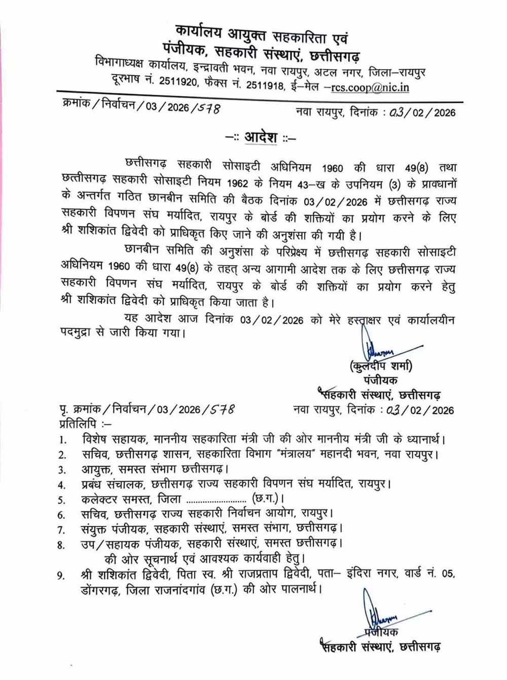 राज्य सहकारी विपणन संघ मर्यादित बोर्ड की शक्तियों का प्रयोग करने शशिकांत द्विवेदी को प्राधिकृत किया गया है, जारी आदेश में लिखा है, छत्तीसगढ़ सहकारी सोसाइटी अधिनियम 1960 की धारा 49 ( 8 ) तथा छत्तीसगढ़ सहकारी सोसाइटी नियम 1962 के नियम 43-ख के उपनियम (3) के प्रावधानों के अन्तर्गत गठित छानबीन समिति की बैठक दिनांक 03/02/2026 में छत्तीसगढ़ राज्य सहकारी विपणन संघ मर्यादित, रायपुर के बोर्ड की शक्तियों का प्रयोग करने के लिए शशिकांत द्विवेदी को प्राधिकृत किए जाने की अनुशंसा की गयी है। छानबीन समिति की अनुशंसा के परिप्रेक्ष्य में छत्तीसगढ़ सहकारी सोसाइटी अधिनियम 1960 की धारा 49 ( 8 ) के तहत् अन्य आगामी आदेश तक के लिए छत्तीसगढ़ राज्य सहकारी विपणन संघ मर्यादित, रायपुर के बोर्ड की शक्तियों का प्रयोग करने हेतु शशिकांत द्विवेदी को प्राधिकृत किया जाता है। यह आदेश आज दिनांक 03/02/2026 को मेरे हस्ताक्षर एवं कार्यालयीन पदमुद्रा से जारी किया गया ।