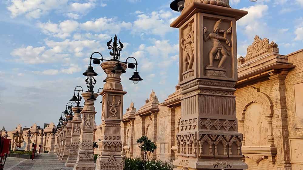 नौ प्रवेश द्वारों का डिजाइन पारंपरिक भारतीय स्थापत्य और आधुनिक इंजीनियरिंग तकनीक का संतुलित समन्वय होगा। निर्माण में बंसी पहाड़पुर के गुलाबी–सफेद पत्थर और जैसलमेर के पीले पत्थर का उपयोग किया जाएगा। द्वारों पर 10 से 50 मिमी तक की गहरी 3-डी नक्काशी की जाएगी, जिसमें पौराणिक प्रसंग, धार्मिक प्रतीक, शेर, हाथी, मानव आकृतियां और सांस्कृतिक चिन्ह उकेरे जाएंगे।