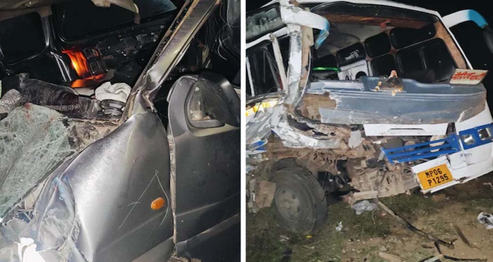 मध्य प्रदेश के भिंड में शुक्रवार देर रात बस और वैन आमने-सामने भिड़ गए। हादसे में 5 लोगों की मौत हो गई, जबकि 7 अन्य लोग गंभीर रूप से घायल हैं। टक्कर इतनी भीषण थी कि वैन पूरी तरह से टूट गई। उसमें सवार लोग अंदर ही फंस गए। हादसा गोहद चौराहा थाना अंतर्गत छींमका गांव के पास नेशनल हाईवे-719 पर रात 2.30 बजे हुआ। गोहद चौराहा थाना प्रभारी मनीष धाकड़ के अनुसार, ईको और वैन ग्वालियर से सवारियों को लेकर भिंड की ओर आ रहा था, जबकि बस भिंड से ग्वालियर की ओर जा रही थी।
