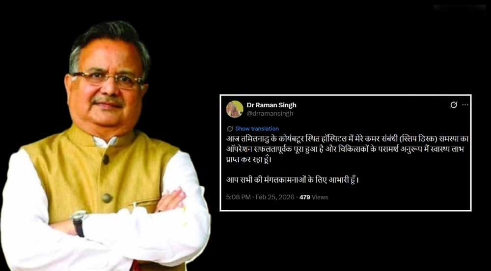 विधानसभा अध्यक्ष डॉ रमन सिंह का कोयंबटूर में स्लिप डिस्क का ऑपरेशन हुआ. डॉक्टर रमन सिंह का आपरेशन सफल रहा. खुद डॉक्टर रमन सिंह ने सोशल मीडिया साइट x पर पोस्ट कर इसकी जानकारी दी. (CG Vidhansabha Speaker) डॉ. रमन सिंह ने पोस्ट कर कहा कि “आज तमिलनाडु के कोयंबटूर स्थित हॉस्पिटल में मेरे कमर संबंधी (स्लिप डिस्क) समस्या का ऑपरेशन सफलतापूर्वक पूरा हुआ है और चिकित्सकों के परामर्श अनुरूप मैं स्वास्थ्य लाभ प्राप्त कर रहा हूँ.