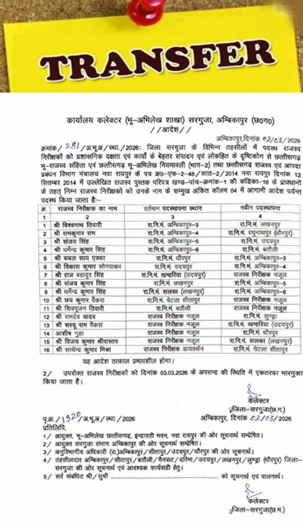इस तरह धर्मेन्द्र कुमार सिंह का रा.नि.मं. सलका (लखनपुर) से रा.नि.मं. अम्बिकापुर-6, छय कुमार पैंकरा का रा.नि.मं. पेटला सीतापुर से राजस्व निरीक्षक नजूल, शिवपूजन तिवारी का रा.नि.मं. बतौली से राजस्व निरीक्षक नजूल, रामदेव यादव का राजस्व निरीक्षक नजूल से रा.नि.मं. लुण्ड्रा, सरयू राम पैंकरा का राजस्व निरीक्षक नजूल से रा.नि.मंखम्हरिया (उदयपुर), आशीष गुहा का राजस्व निरीक्षक नजूल से रा.नि.मं. धौरपुर, विजय कुमार श्रीवास्तव राजस्व निरीक्षक नजूल से रा.नि.मं. सलका (लखनपुर), सत्येन्द्र कुमार मिश्रा से राजस्व निरीक्षक डायवर्सन का रा.नि.मं. पेटला सीतापुर तबादला किया गया है.