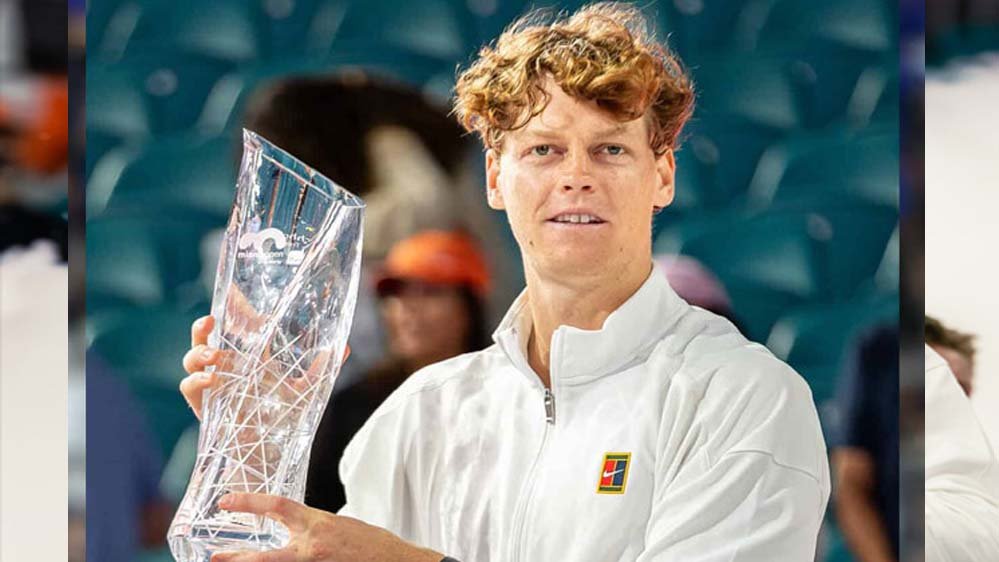 इटली के स्टार टेनिस खिलाड़ी जैनिक सिनर ने मियामी ओपन का खिताब जीत लिया है। उन्होंने फाइनल मुकाबले में चेक गणराज्य के जिरी लेहेका को 6-4, 6-4 से हराया। इस जीत के साथ ही सिनर ने 'सनशाइन डबल' भी पूरा किया। जैनिक सिनर फाइनल में जिरी लेहेका को 6-4, 6-4 से हराकर 2017 में रोजर फेडरर के बाद एक ही सीजन में इंडियन वेल्स और मियामी जीतने वाले पहले पुरुष खिलाड़ी बन गए। इसके अलावा, सिनर दोनों इवेंट्स में एक भी सेट गंवाए बिना यह उपलब्धि हासिल करने वाले पहले खिलाड़ी हैं।