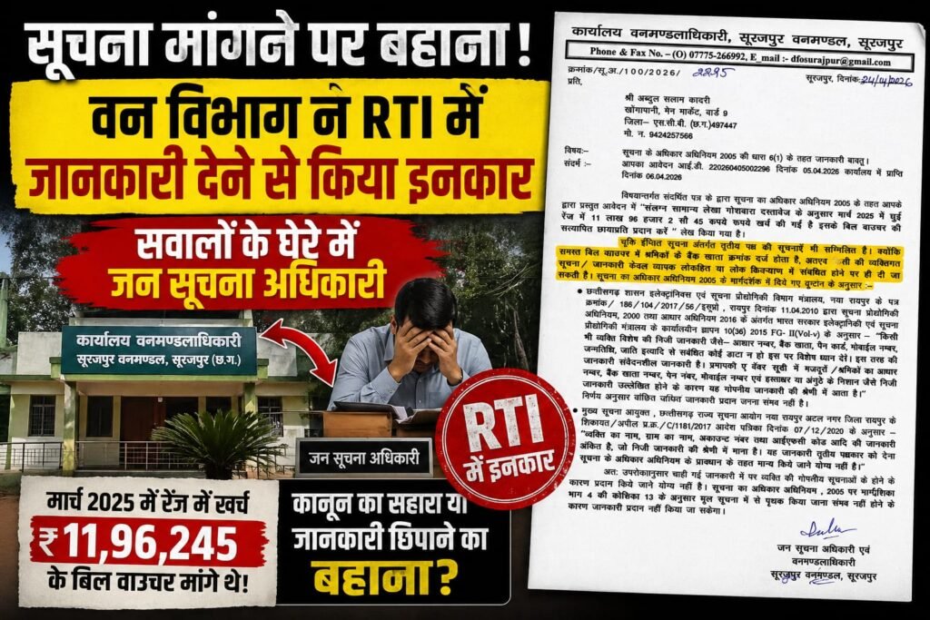 सूरजपुर, छत्तीसगढ़। सूरजपुर वनमंडल कार्यालय से एक ऐसा पत्र सामने आया है जिसने सूचना के अधिकार कानून की पारदर्शिता पर सवाल खड़े कर दिए हैं। आवेदक अब्दुल सलाम कादरी द्वारा मांगी गई जानकारी पर जन सूचना अधिकारी ने सीधे तौर पर जानकारी देने से मना कर दिया। मामला मार्च 2025 में रेंज कार्यालय में हुए 11 लाख 96 हजार 245 रुपये के खर्च से जुड़ा है, जिसके बिल वाउचर और भुगतान संबंधी दस्तावेज मांगे गए थे।