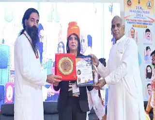 अयोध्या में हुए दो दिवसीय योग महाकुंभ राष्ट्रीय योग वीर सम्मान समारोह में झारखंड से रांची निवासी योग शिक्षिका अर्चना को स्वामी धीरेंद्र ब्रहमचारी योग