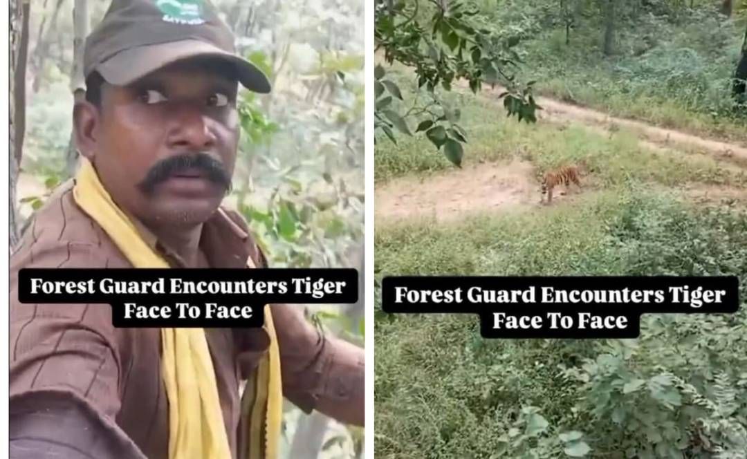 जंगल में ड्यूटी पर तैनात फॉरेस्ट गार्ड के सामने अचानक से आ धमका बाघ, कमजोर दिल वाले न देखें VIDEO