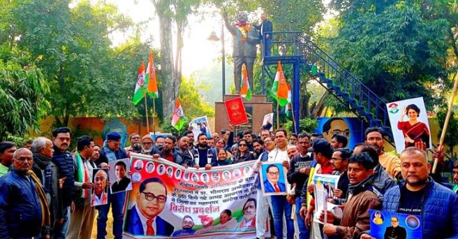 अलीगढ़ । केंद्रीय गृहमंत्री अमित शाह द्वारा राज्यसभा में बाबा साहब डॉ भीमराव अंबेडकर के प्रति की गई अभद्र टिप्पणी पर कांग्रेसजनों का विरोध प्रदर्शन