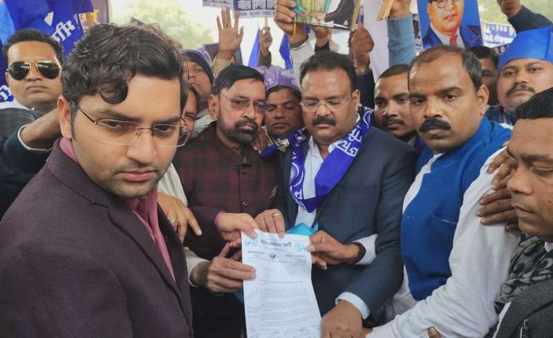बहुजन समाज पार्टी के कार्यकर्ताओं ने गृह मंत्री अमित शाह की टिप्पणी के विरोध में दबरई पर किया धरना प्रदर्शन