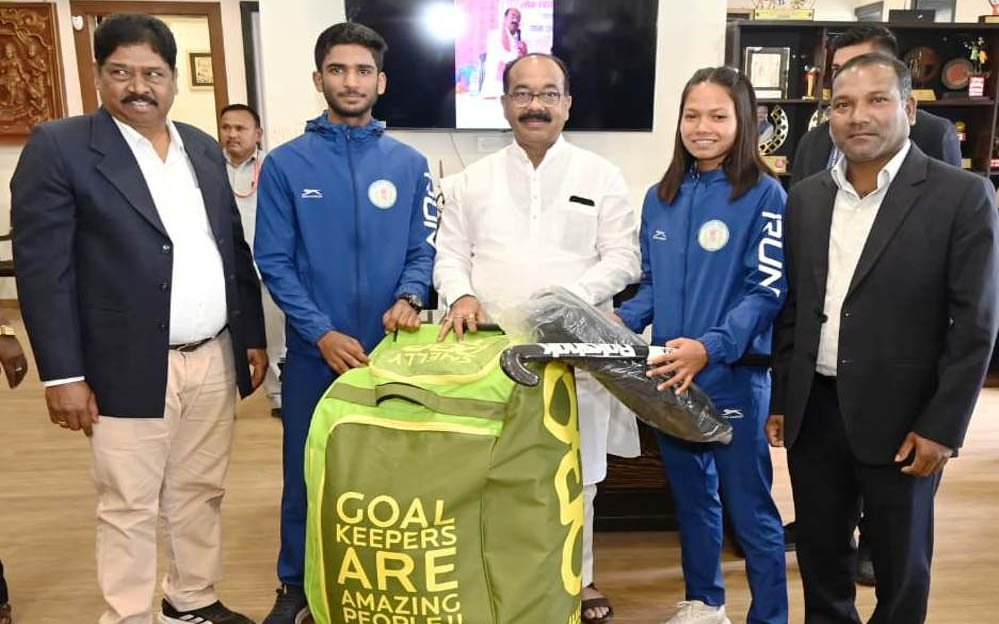 रायपुर: उप मुख्यमंत्री अरुण साव ने नेशनल सेंटर ऑफ एक्सीलेंस में चयनित खिलाड़ियों को दिए हॉकी किट
