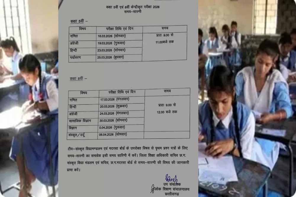 रायपुर. छत्तीसगढ़ लोक शिक्षा संचालनालय ने कक्षा 5वीं और 8वीं की वार्षिक परीक्षा की समय सारिणी जारी कर दी है. इस बार परीक्षाएं बोर्ड पैटर्न